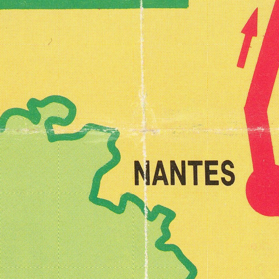 A vintage Tour de France map showing the 1990 edition of the event. Riders started at the "Futuroscope" theme park near Poitiers before making their way through Nantes, the Mont-Saint-Michel, Geneva, L'Alpe d'Huez, Le Puy en Velay, Lourdes, Bordeaux, and Limoges before arriving at the Champs-Elysees.