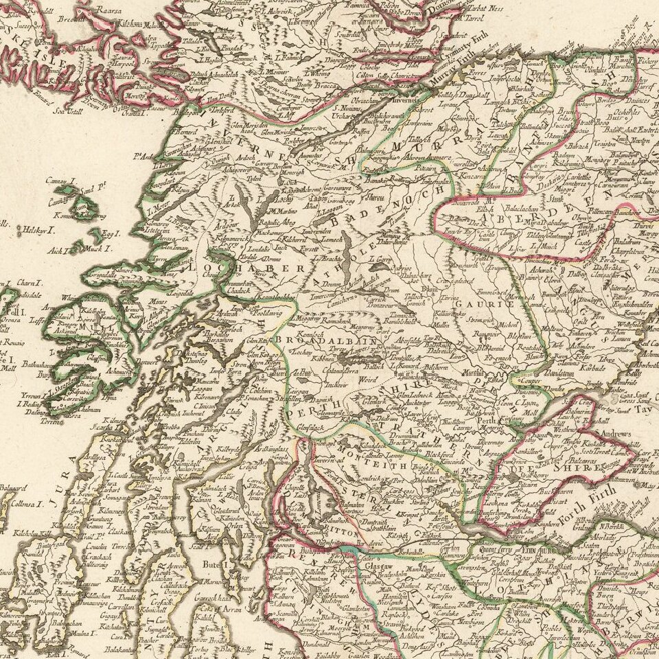 Decorative Italian map of Scotland, published by Santini in Venice and engraved by Remondini.