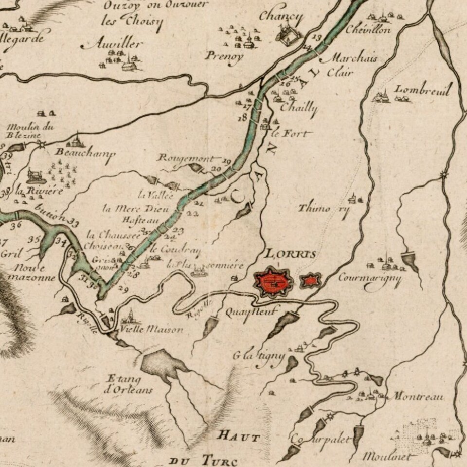 Rare early plan showing the Canal de Briare and the Canal D'Orleans, including keys identifying 65 places and 27 places on the two different canals, a dedication cartouche and illustration of a lock.