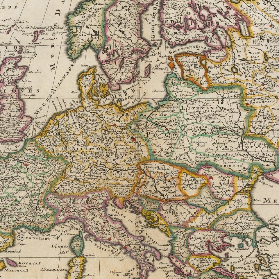 Handsome hand-colored map of Europe, based on the geography of the French master cartographer Nicolas Sanson.