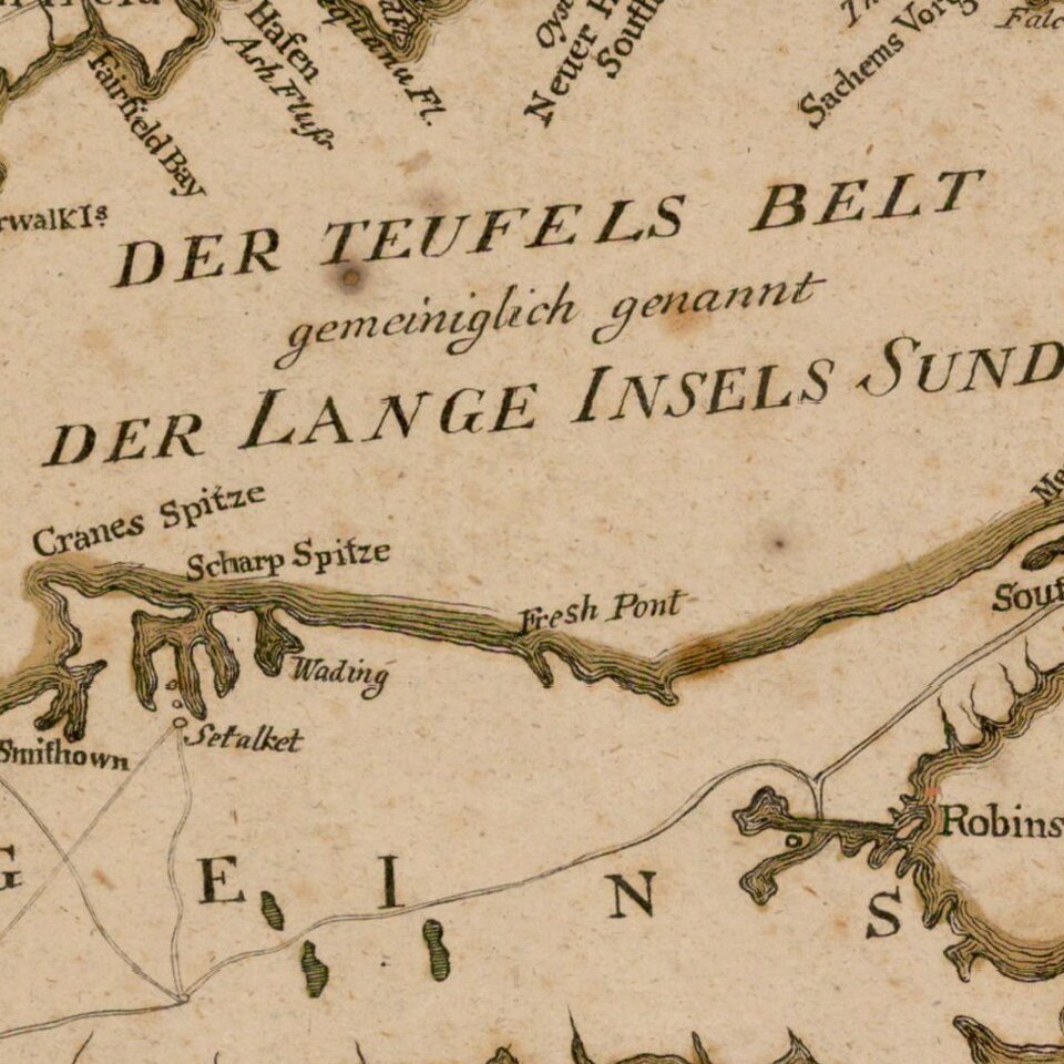 A close comparison of Muller's map and the 1755 Jefferys's map suggests that Muller's map was likely drawn directly from the Jefferys, as the title ( Der Teufels Belt gemeiniglich genannt der Lange Insels Sund) is the German translation for the Jefferys's legend. In Long Island Sound, The Devils Belt, commonly called Long Island Sound, and the roads, topographical details and name placements in the Muller map closely follow Jefferys's. While the 1775 Montressor uses the same name for Long Island Sound, there is much less similarity between the Muller map and the Montressor map.