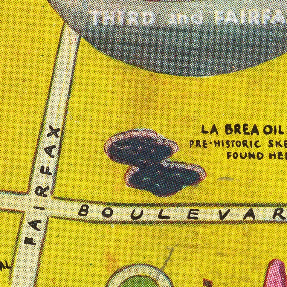 The map is a wonderful and shows some local highlights like the La Brea Tar Pits, Signal Hill Oil Field, LA Coliseum, Santa Monica, Ocean Park, Venice and more Piers with their Amusements, Santa Anita Race Track and shows Barstow, Las Vegas, Boulder Dam, Death Valley, Yosemite, Mariposa Grove and other places way off in the distance.