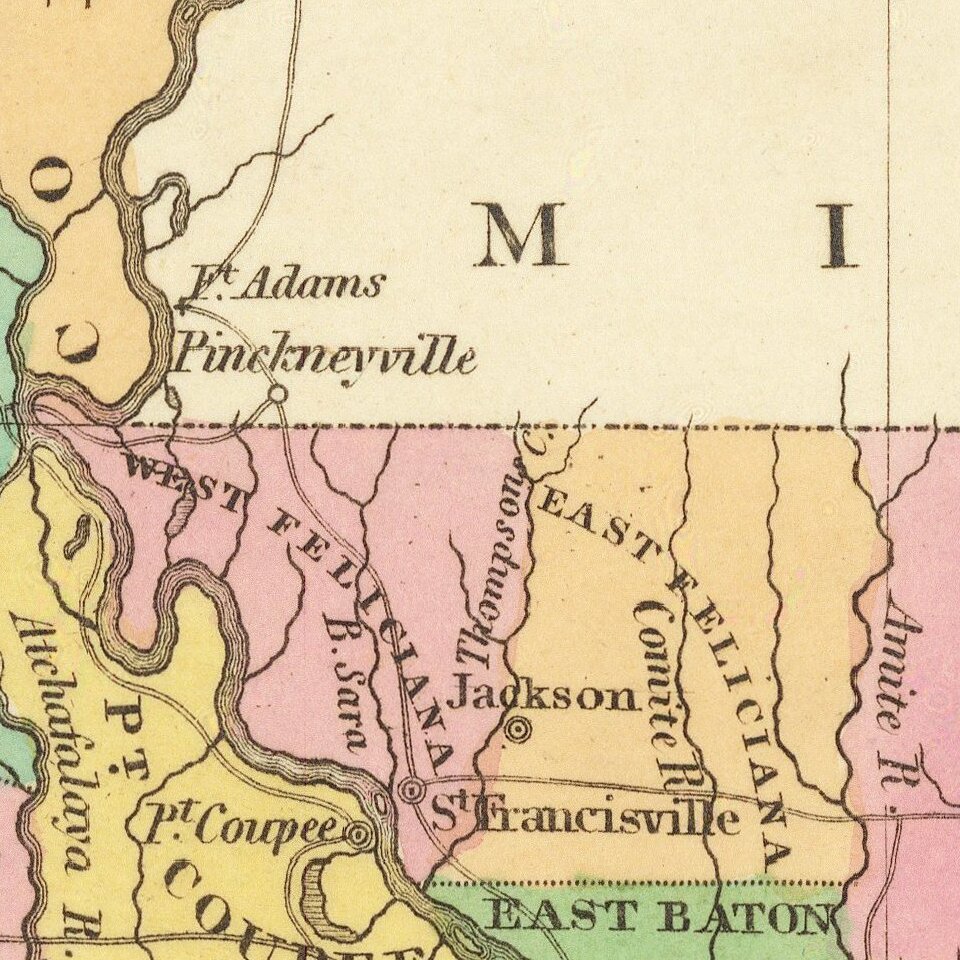 The map shows early parish configurations, with a number of northern and western parishes still not formed. Parishes are the Louisiana equivalent of counties, inherited from the French colonial paroisses. Modern Louisiana has 64 such parishes, while this map only shows a little over two dozen. East and West Feliciana are shown in this map as separate, which divided from Feliciana Parish in 1824, the same year as this map was published. Feliciana comprised the Louisiana portion of West Florida.