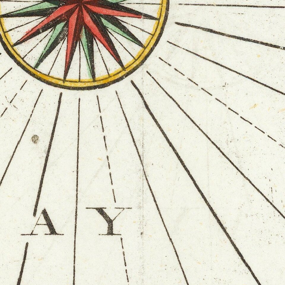 Stippling reveals the droogtes, or dry areas that hug the shore. A compass rose sits dramatically in the middle of the bay. Numerous ships are sailing or idling on the water, underlining the importance of Manila as a port.