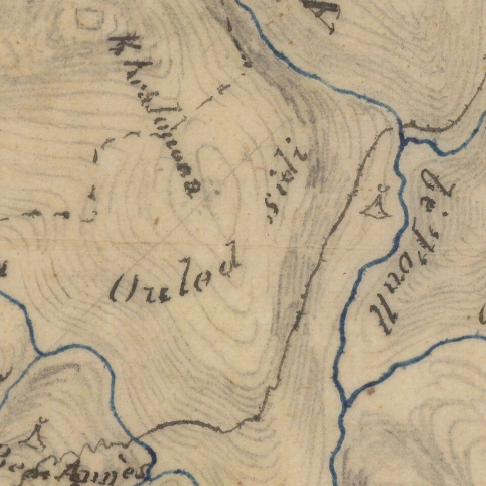 This manuscript map shows the area between Blida and Medea, in northern Algeria. The hilly terrain is shown with contour lines. There are also many rivers and the routes, shown with solid and dotted lines, between the settlements. It would appear to be related to another, similar map in the collection.