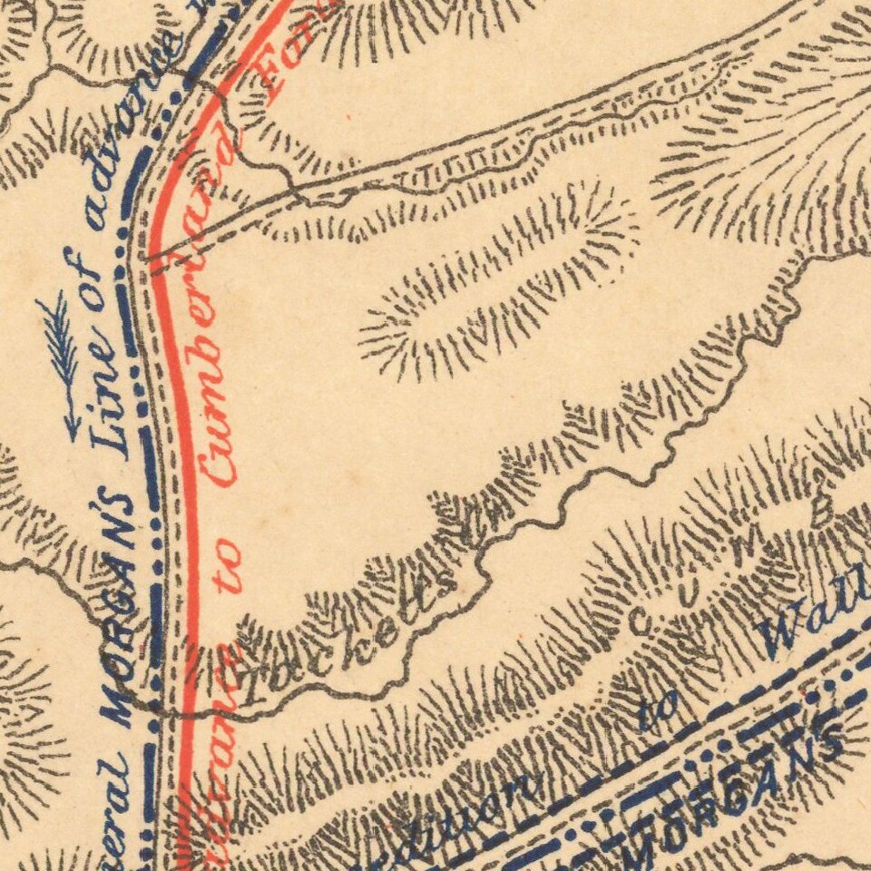 Interesting color-printed battle plan showing the operations of General G. W. Morgan in the Cumberland Gap, Tennessee. General Morgan's actions resulted in the capture of the Cumberland Gap for the Union. The Union occupied the Gap for three months.