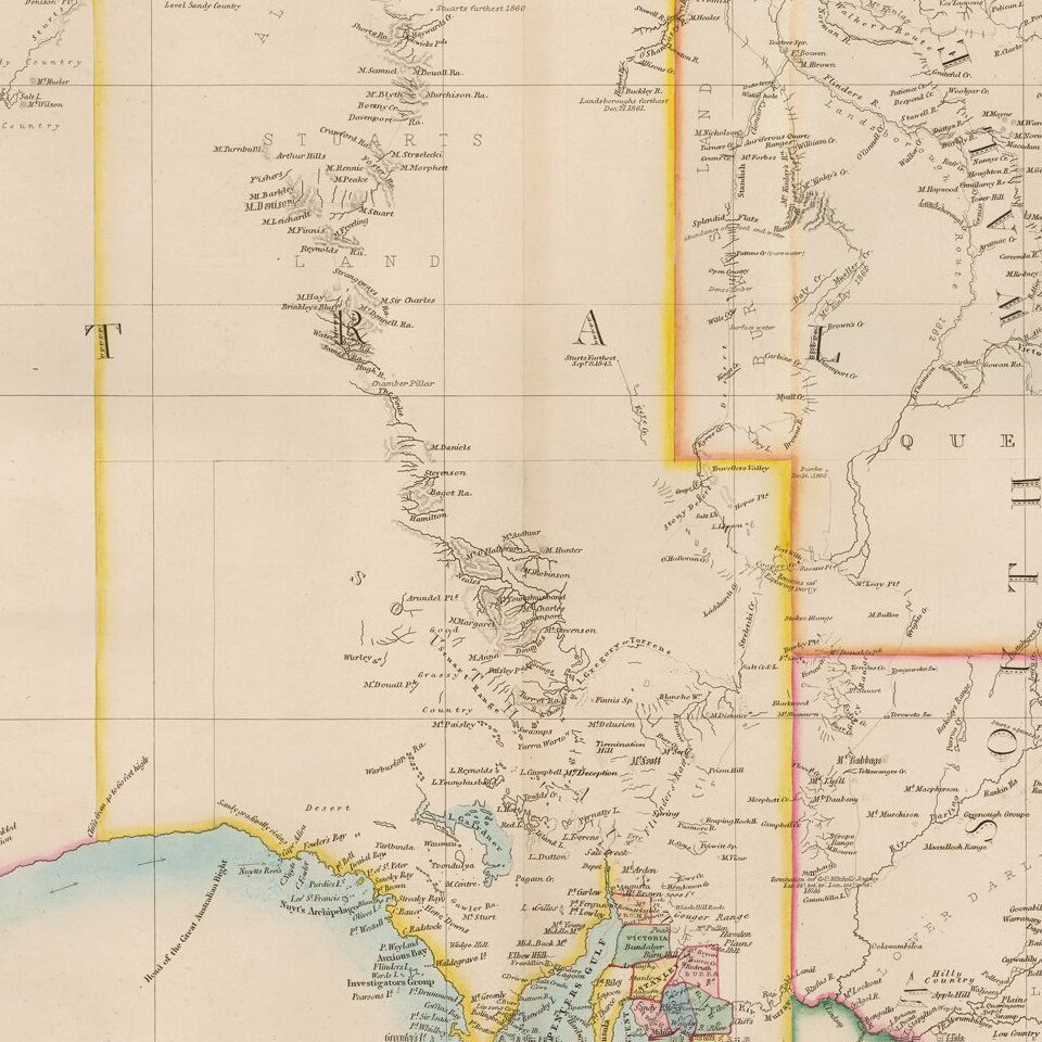 Importantly the map depicts the recent discoveries of several explorers, especially with respect to the conspicuous detail in the interior of what in now Victoria and the far southern part of New South Wales. On various treks from 1824 to 1828, Hamilton Hume discovered the overland route from Sydney to Port Philipp (the future site of Melbourne), as well as the Darling River, the Murray River's longest tributary. Knowledge of the Murray Basin and surrounding regions was expanded upon by the expeditions of Charles Sturt from 1828 to 1830 and Sir Thomas Mitchell from 1831 to 1836. Mitchell had previously been responsible for the mapping of the settled regions of New South Wales as shown on this map, an achievement for which he received his knighthood.