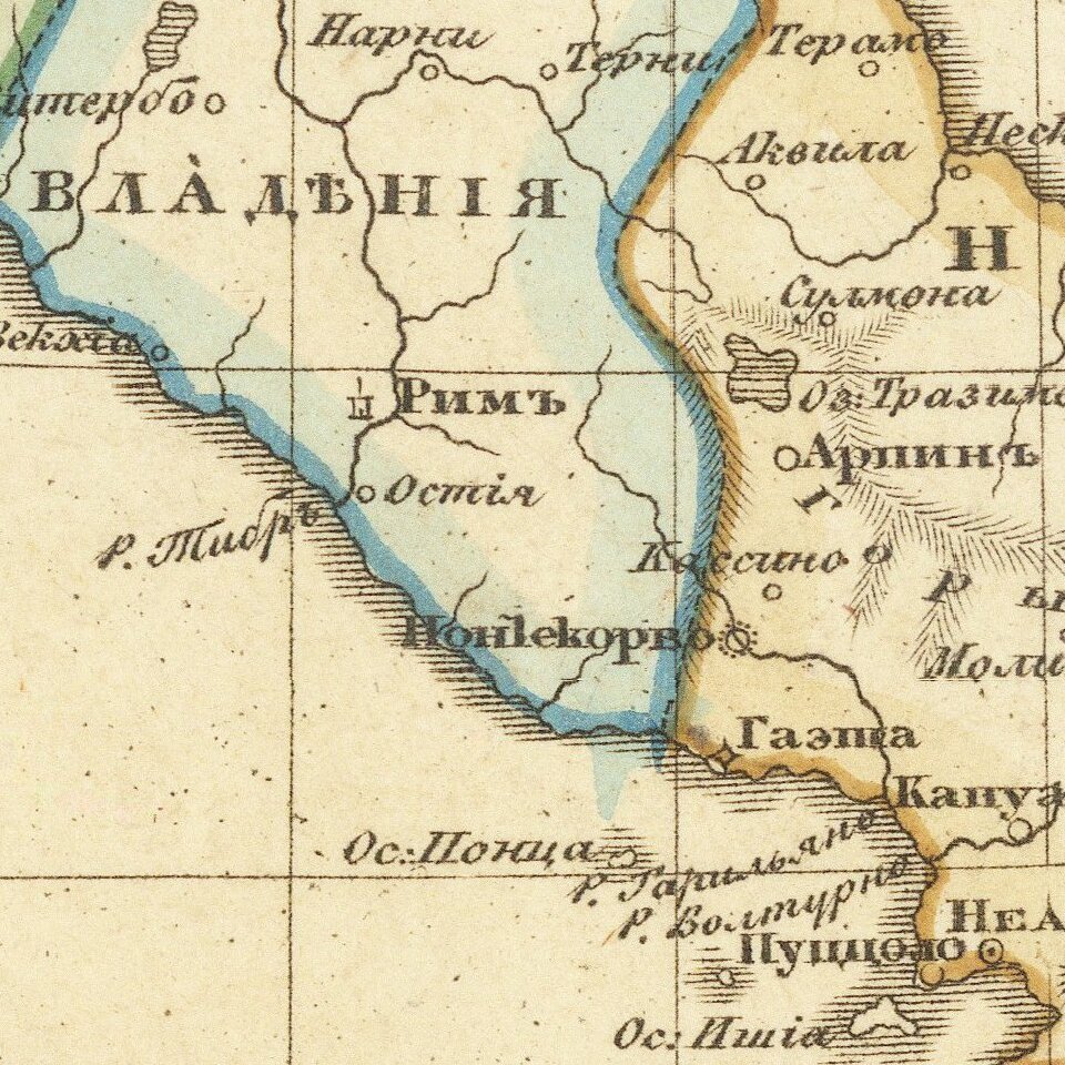 Detailed and very rare Russian-language map of Italy, Sicily, Corsica and Sardinia, published in Saint Petersburg in 1836.