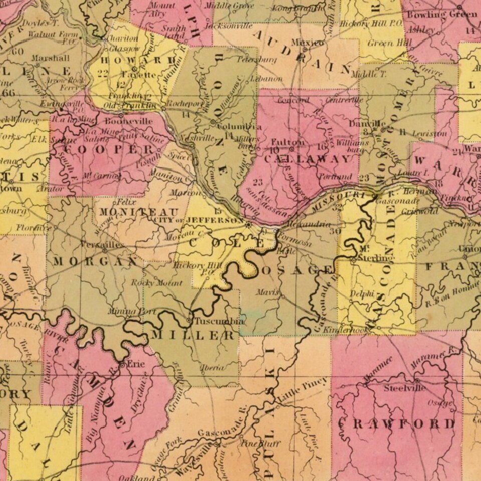 Detailed map of Missouri, hand colored by counties, and showing towns, roads, rivers, mountains, lakes, forts, Post Offices and other details.