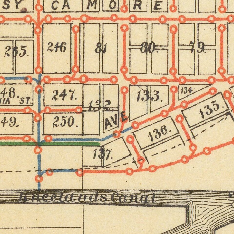In 1888, the government took the approach of diluting the polluted waters with clean water from Lake Michigan. They built a flushing tunnel (illustrated here in green), which pumped water from Lake Michigan into the stagnant Milwaukee River, just below the North Avenue Dam. The present map illustrates the progress in creating the city's solution to the problem in its eighth year, following the city's publication of an 1889 report entitled, “Report of the Commission of Engineers on the Collection and Final Disposal of the Sewage and on the Water Supply of the City of Milwaukee.”