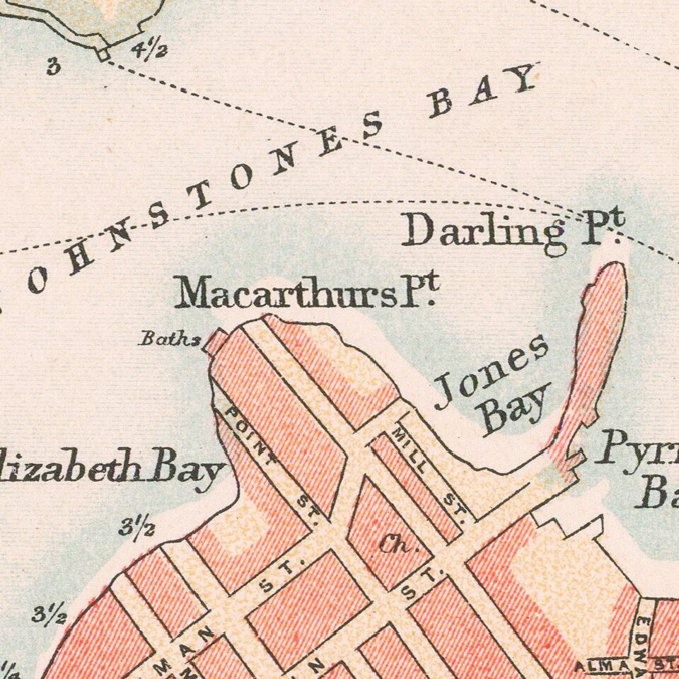 More indications of the early history of the settlement are written into the landmarks and streets of this map. Fort Macquarie was a square fortress whose construction began in 1817 and finished in 1821. It was named for Lacklan Macquarie, the governor of New South Wales from 1810 to 1821. Streets near the fort still bear Macquarie’s name. The fort was demolished in 1901, just eleven years after this map was made, to be replaced by electric tramway sheds. Those, in turn, were demolished in 1959 to make way for the iconic Sydney Opera House.