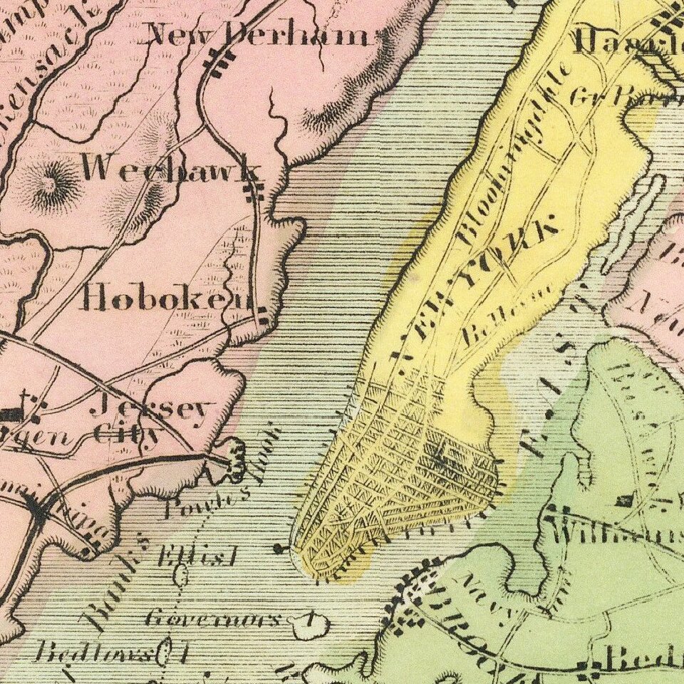 Striking full color example of David Burr's map of New York City, which was issued separately and also appeared in his Universal Atlas, first issued in 1836.