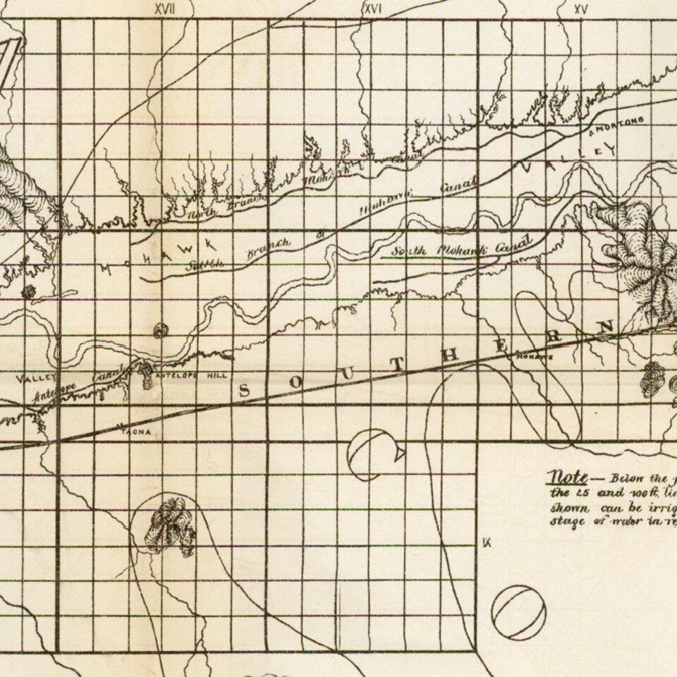 The map was prepared by the Citizens Executive Committee on a proposed reservoir and irrigation of Yuma County, in August, 1889. Terrific detail along the Gila River including surveyed townships and topography. Lines show the limits of irrigated lands at different water levels in the proposed reservoir.