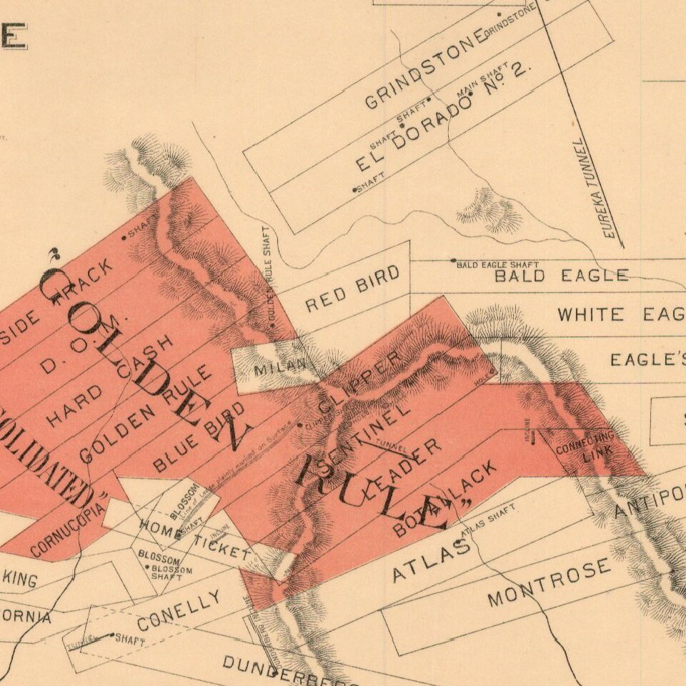 Scarce map of the Golden Rule Mine, located in the Eureka Mining District, one of the most active mining regions of the period. The map was prepared by T.J. Read, who was working both in the private trade and as deputy surveyor for the United States.