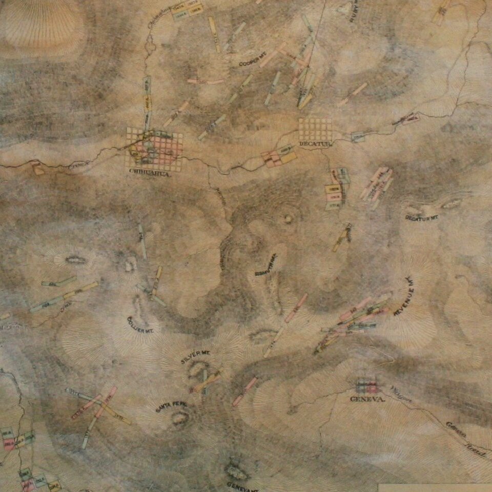 Teal's map provides in fine detail the topography of the region, lode claims, mountains, rivers, mountain passes, and town plats for Geneva, Montezuma, Chihuahua, and Decatur. Mountain passes listed include Webster, Loveland, and Argentine.