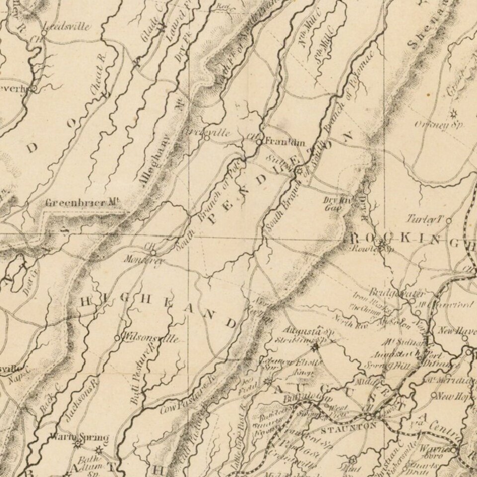 The lithographic plate engraved by Charles Ludwig for the Ritchie & Dunnivant map was utilized again by West & Johnston in 1862, for the present map. A new decorative border was added for the present map, along with an updated table of railroads and some minor geographical changes, which are outlined by William Wooldridge in his comprehensive study of the Bucholtz map and its 3 derivates, published in the Spring 2007 edition of The Portolan. As noted by Wooldridge, the map was also used by Matthew Fontaine Maury, with additions, in connection with his work on the state of Virginia published in 1868, and also by a map commonly referred to as the Virginia Military Institute (VMI) map.