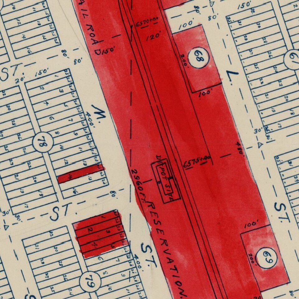 Detailed 1897 survey of Ingomar in Merced, California, by Lott D. Norton, one of the primary surveyors for the Pacific Improvement Company.