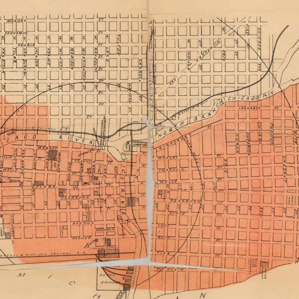 Rare map of Chicago, focusing on the parts of town which were affected by the Great Chicago Fire, October 10, 1871.