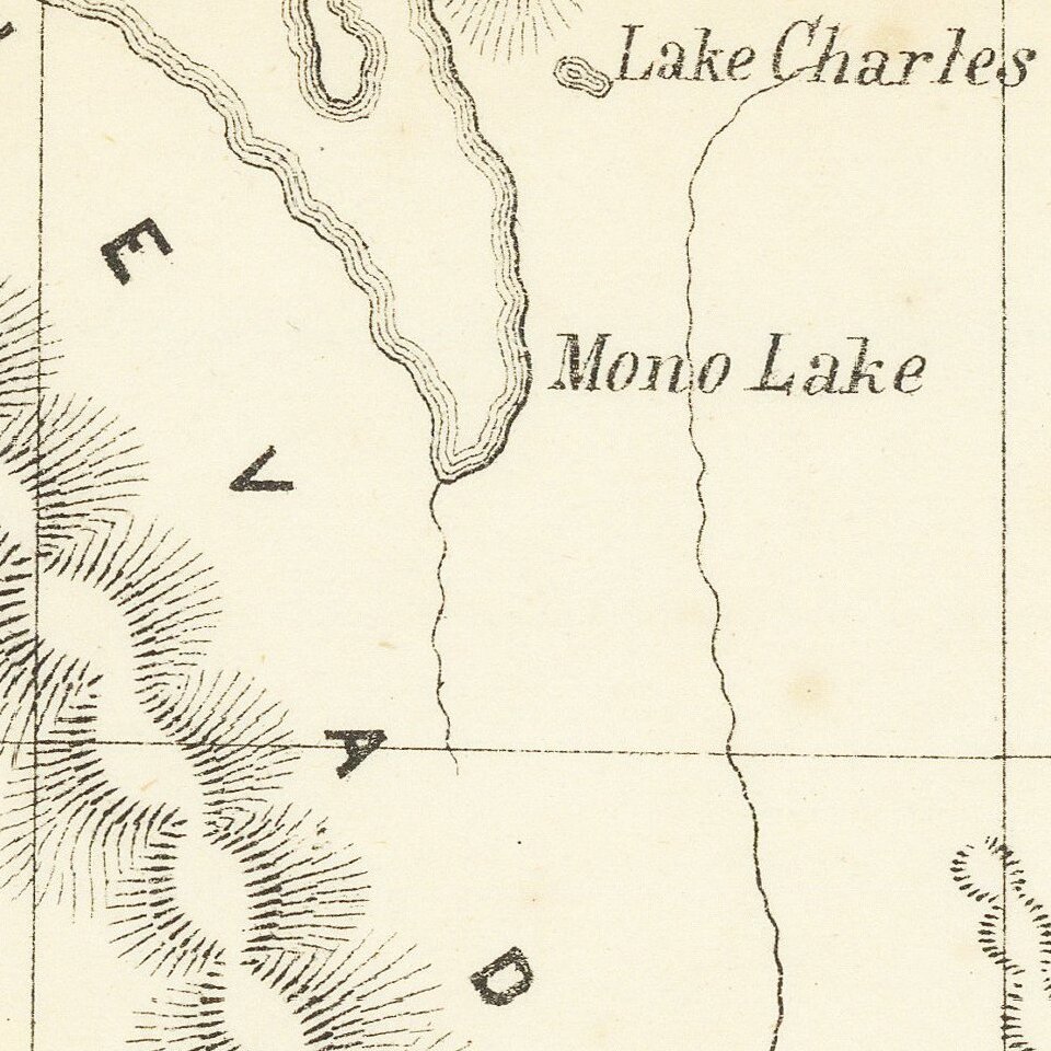 The tale behind the map is as follows. Three army detachments set out in 1855 with the intention of finding shorter and less rugged routes for emigrants and mail carriers heading to the west coast. One group, led by Colonel E. J. Steptoe, followed the Humboldt and Carson Rivers and then crossed the Sierra to Sacramento and Benicia. A second, led by Captain Rufus Ingalls, took the usual route to the Great Salt Lake and down the Humboldt, but then bore northwest into southern Oregon and finally south to Sacramento. The third group, under the command of Lieutenant Sylvester Mowry, went south past the Mormon settlements of Provo and Nephi, came near the site of the Gunnison massacre, and arrived at Las Vegas, which at the time was a small Mormon Indian mission. From there, Mowry crossed the desert, skirted north of the San Gabriel mountains, and eventually reached Ft. Tejon via Cajon Pass, a tiny Los Angeles, and Tejon Pass.