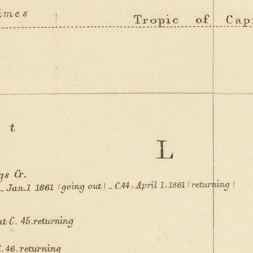 As the title block indicates, this map was drawn based on details in Wills’ field book. In the mid-nineteenth century, the interior of Australia remained largely unknown to those of European descent. The Royal Society of Victoria sought to mitigate this lacuna in knowledge by planning a cross-continental expedition that would bisect the country south to north. The explorers were to map their route and to identify possible arable land. They were also to hurry, as the Royal Society of Victoria wanted their men to beat the rival expedition of John McDouall Stuart.