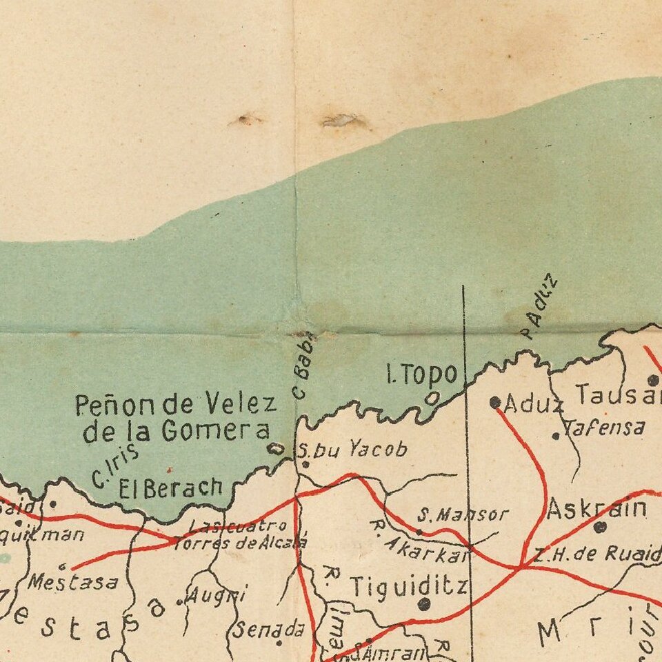 The map was issued at or about the time of the Rif War, an armed conflict fought during the first half of the 1920s between the colonial power Spain (later joined by France) and the Berber tribes of the Rif mountainous region. Led by Abd el-Krim, the Riffians at first inflicted several defeats on the Spanish forces by using guerrilla tactics and captured European weapons. After France's military intervention against Abd el-Krim's forces and the major landing of Spanish troops at Al Hoceima, considered the first amphibious landing in history to involve the use of tanks and aircraft, Abd el-Krim surrendered to the French and was taken into exile.