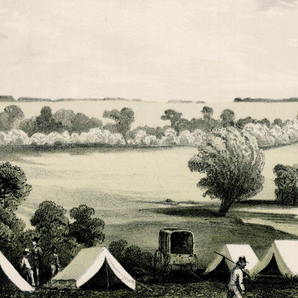 A scenic view as seen by the artist, John Mix Stanley, in 1853, The camp on the Maple River where members of the United States Pacific Railroad party celebrated the Fourth of July in 1853 . Isaac Steverns reports in his Narrative, "After dusk we raised the American flag."