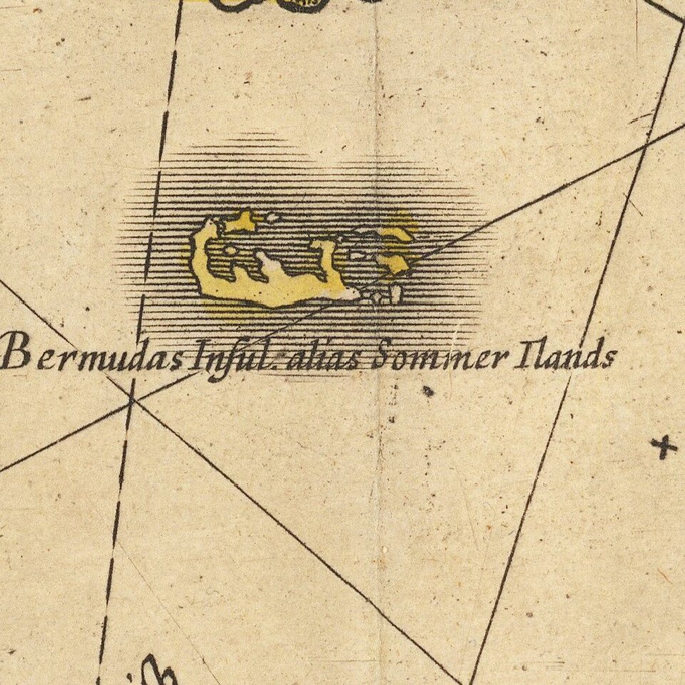 This map is based on Richard Norwood’s survey on behalf of the Bermuda Company, conducted in 1617 from a canoe. Norwood made a map of his work, registered in 1622, but no known example survives today. John Speed created a derivative map which was included in his Prospect of the Most Famous Parts of the World (1627). The plate for the Speed map was originally made by Jodocus Hondius, the Younger. After Hondius died in 1629, the plate was sold to Blaeu, who re-issued the handsome map.