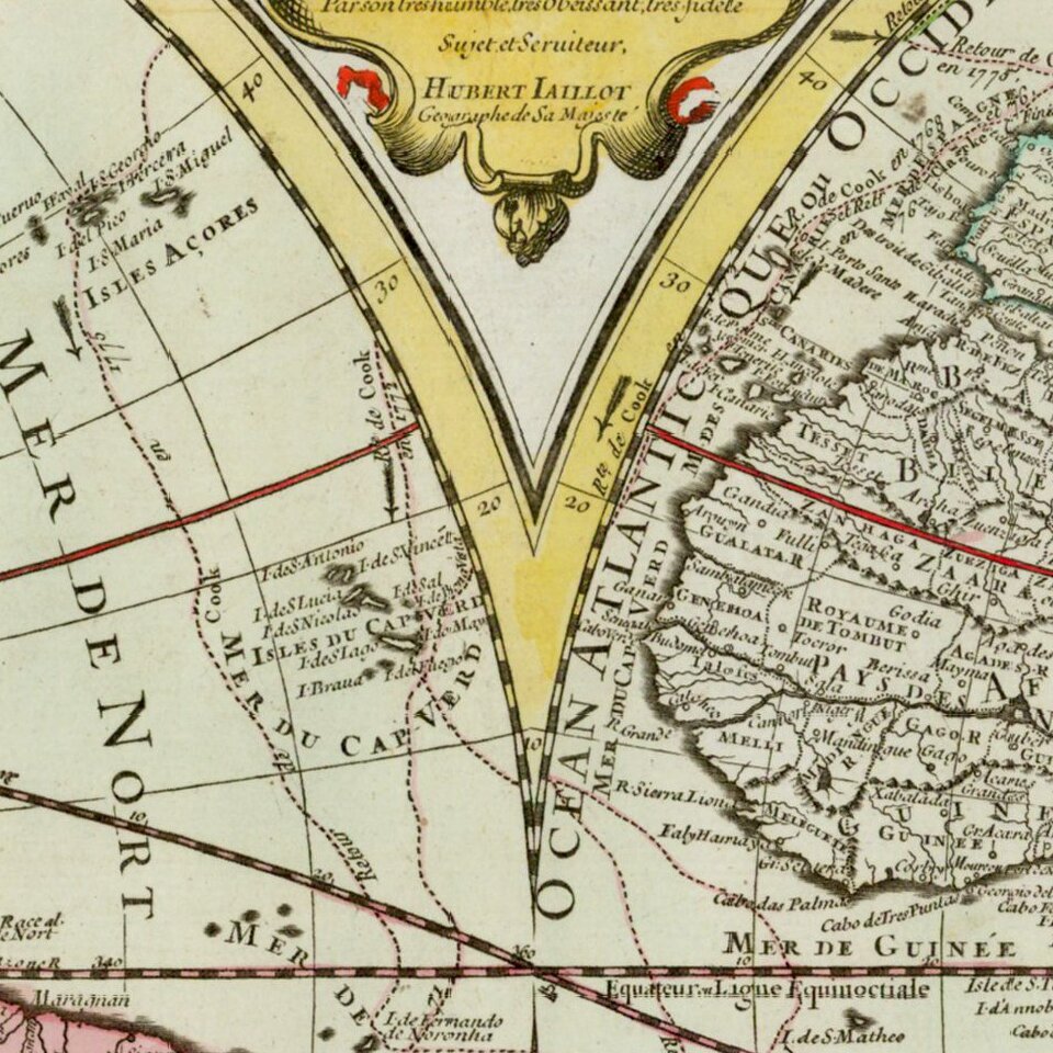 Cook also features prominently in the paratext of the map. In the title block running along the top edge, Brion de la Tour explains that the map is updated according to Cook’s voyages and those that traveled with him and who were sometimes separated from him en route. In the ornate cartouche between the hemispheres at the bottom edge are two mermaids guarding the text within. It explains that the routes pricked on the map are those of Cook, Clarke (sic.) and Gore, and Furneaux, who served with Cook on his third and second voyages respectively. Cook is also mentioned in a note about the projection that runs along the bottom edge of the map.