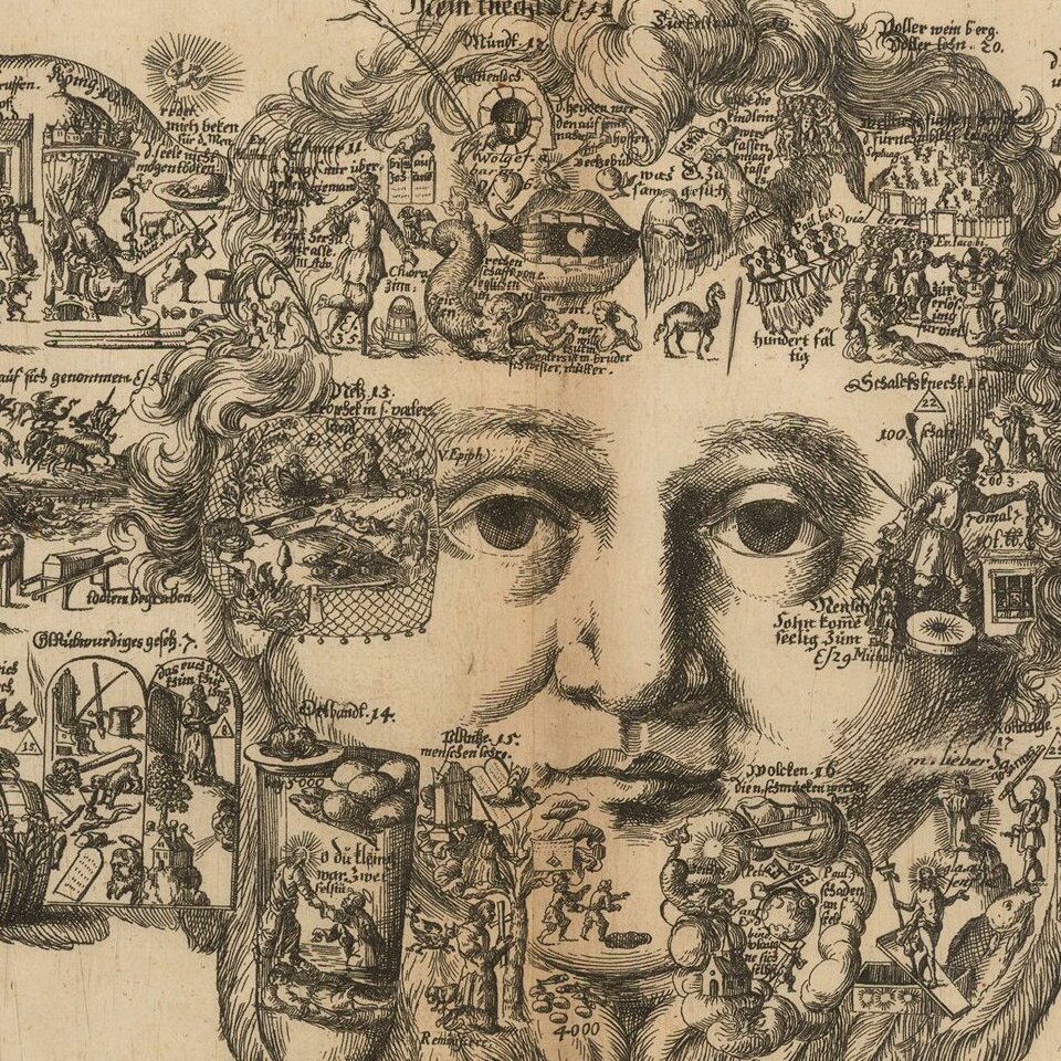 Highly unusual and decorative engraving illustrating stories from the Bible (Gospel of Matthew) in the form of a human face, flanked by a pair of wings.