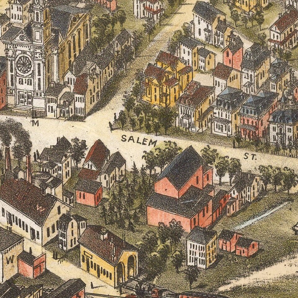 Rare bird's-eye view of Medord, Massachusetts, published by O.H. Bailey in Boston.