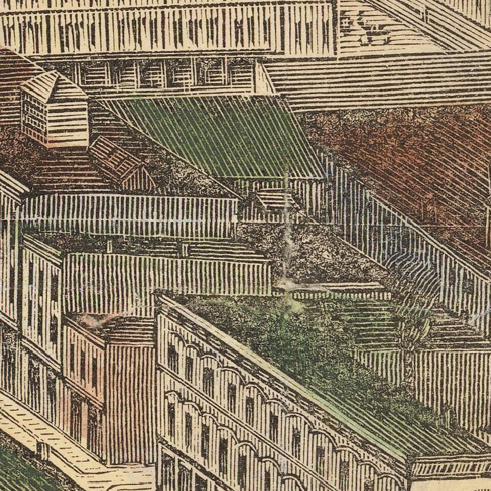 The map shows an up-close view of the paddlewheeler's on the river, with a bustling waterfront scene of horse drawn carts, cargo and supplies, a rail line servicing the waterfront and the city spreading out beyond.