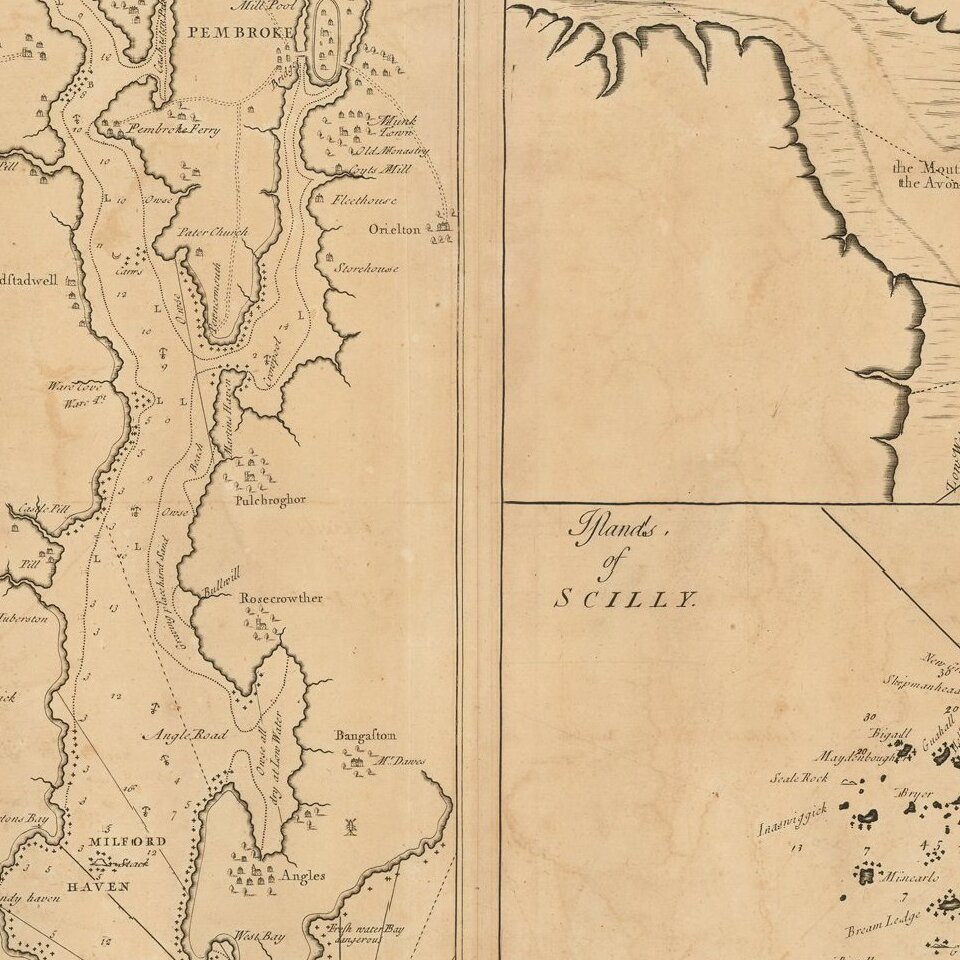 A fascinating and detailed chart of Milford Haven, in Wales, as well as the mouth of the Severn, also in Wales. The third chart is of the Scilly Islands, off Cornwall.