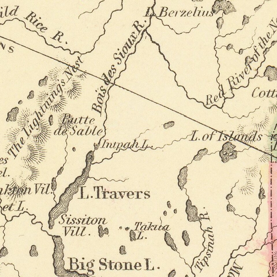 The map shows many Indian tribes, villages and other early notes are shown, along with early towns and roads. Only a small portion of Minnesota has been surveyed.