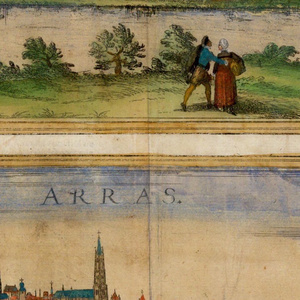 Two early city views of Bergen / Mons in Hainaut, Belgium and Arras, Nord-Pas-de-Calais, North of France, from an early edition of Braun & Hogenberg's Civitates Orbis Terrarum, the most prolific compilation of city views published in the 16th Century.
