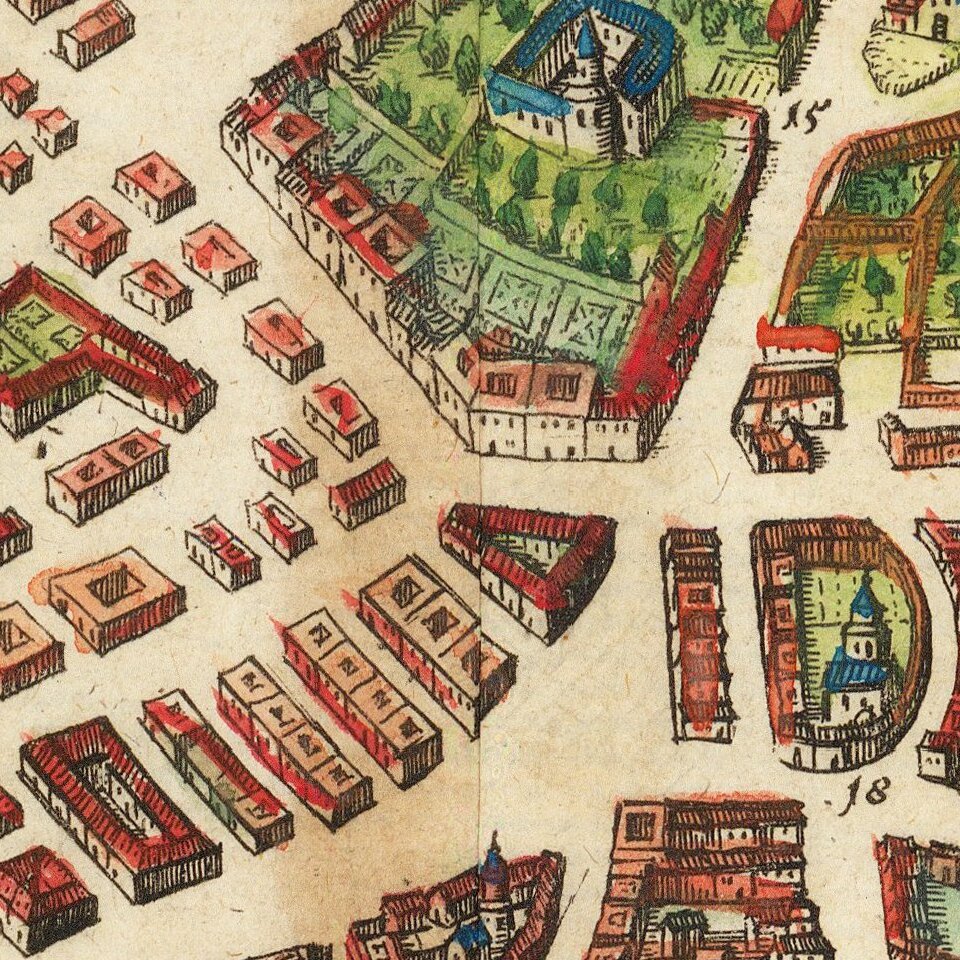 Mathaus Merian (1593-1650) was the father of engraver Matthäus the Younger, and of the painter, engraver, and naturalist Maria Sibylla Merian. He was born in Basel, Switzerland and trained in engraving in Zurich. After a time in Nancy, Paris and Strasbourg, he settled in Frankfurt. While there, he worked for Johann Theodor de Bry, the publisher and son of the travel writer. In 1617, he married Maria Magdalena de Bry, Johann Theodor’s daughter. In 1623, Merian took over the de Bry publishing house upon the death of his father-in-law. Merian’s best known works are detailed town views which, due to their accuracy and artistry, form a valuable record of European urban life in the first half of the sixteenth century