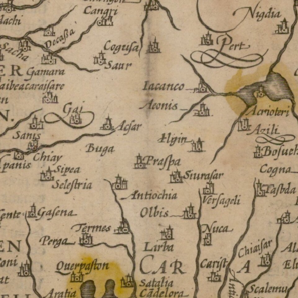 Old color example of Mercator's map of Turkey, Asia Minor and Cyprus.