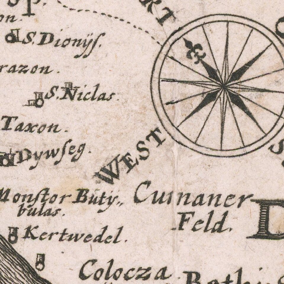 The present map is also an example of a map which includes a "Chronogram," disguising the date of the map within text. Here, the Chronogram appears at the bottom of the cartouche as follows: Gott ste Vre DeM b LVtg Ir Igen Türken Ant I Chr Ist (concealing the date of 1664 for the map).