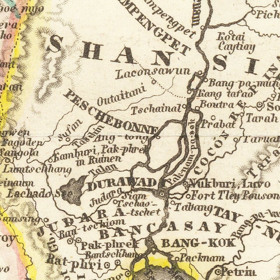 Detailed regional map of the Malay Peninsula, Vietnam, Cambodia, etc. extending from the Straits of Malacca and Singapore north to Hainan and the Gulf of Tonquin. From Meyer's Hand-Atlas. A bit toned and soiled. Extremely detailed regional map. A marvelous example of the fine, precise German engraving style of the mid-19th century.