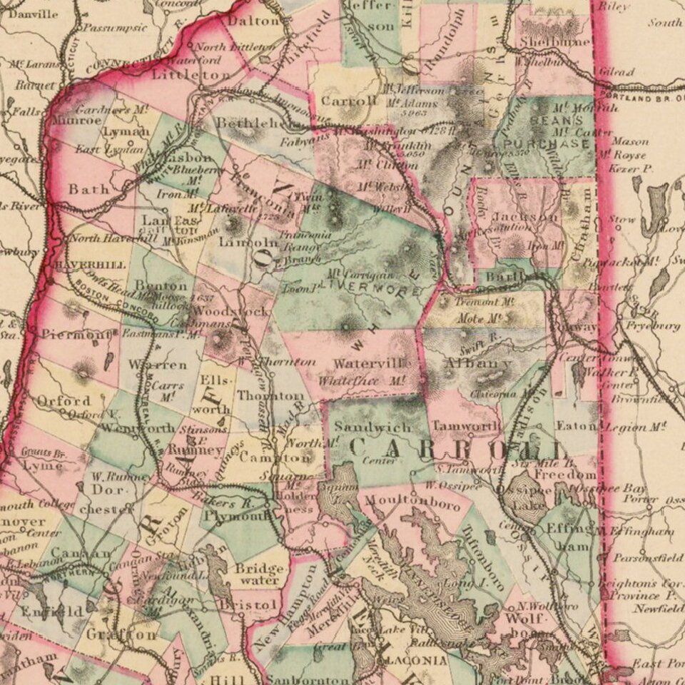 Detailed map of New Hampshire, colored by townships and showing towns, counties, rivers, railroads, and substantial additional details.