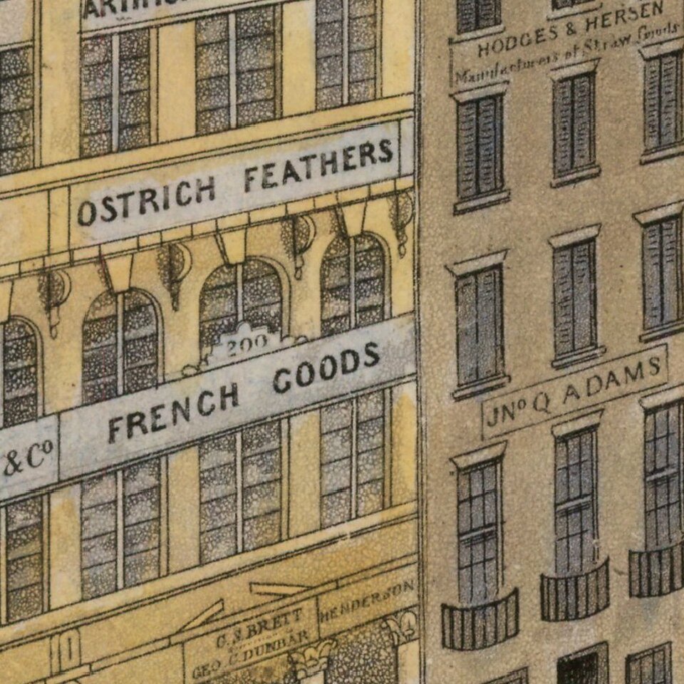 The view shows various commercial buildings in New York City, inlcuding P.T. Barnum's American Museum and the Daguerrian Miniature Gallery of the famous American photographer Mathew Brady.