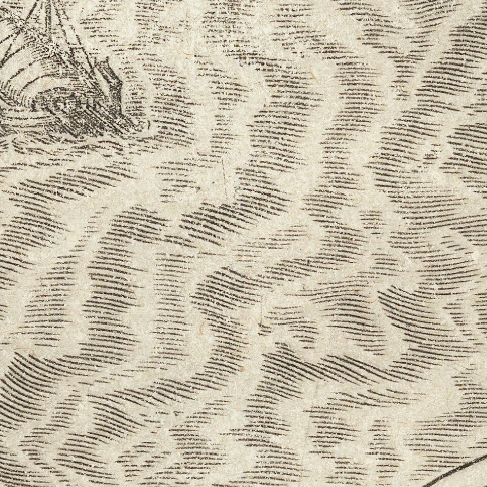 The present example is the first of three states of the map. It features the date 1597 in the title and can be distinguished from the second state (printed in 1607), in which the date has been removed. Curiously both the first and the second states feature the erroneous demarcation of 30 degrees latitude in the left-hand margin, a detail that would be corrected to 39 degrees in the third state (1611). The map is a highly elegant example of engraving, featuring a large compass rose and Wytfliet's signature wavy striations marking the seas.