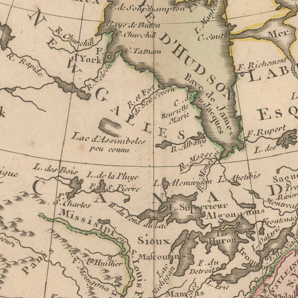The Mississippi River drainage is now well explored by the French, who are now shifting west following the end of the French & Indian War. A number of French forts shown, including Detroit, S. Pierre, S. Charles, S. Phillipe, Huillier, S. Francisco, and Rosalie.