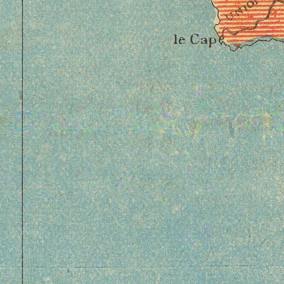 Perhaps intentionally the map represents the British colonies with almost exactly the same graphic coloration as the French colonies making it difficult to differentiate between the two - French colonies are red striped and British colonies are red striped with faint yellow stripes.