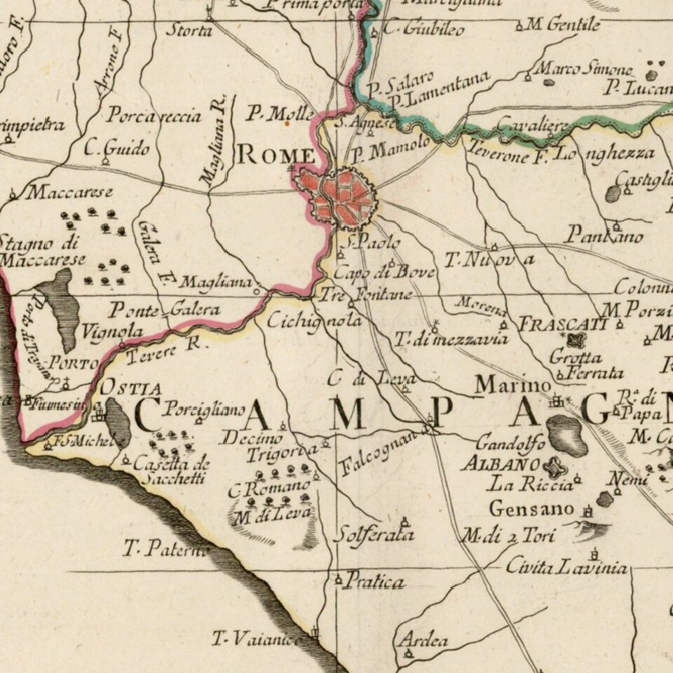 Scarce regional map of the State of the Church (Rome at the center) and environs, published in Venice by Francois Santini.