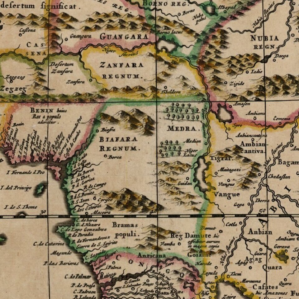 Includes marvelous detail in the interior of the continent. The present edition is the rare first state of the map, with the date in the second cartouche (removed in state 2) and the number 3 not yet included in the upper right corner (added in state 3).