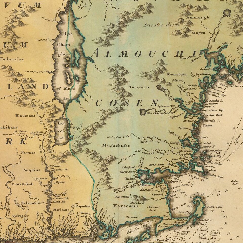 The map shows that as the number of English settlements increased in the area, Native American tribal names are notably less plentiful than on Dutch maps of the previous century. The decorative title cartouche shows a European bartering with an Indian for an animal pelt, one of the mainstays of the early New England economy. The cartouche also reveals what the European was offering for trade, including beads, a barrel (presumably filled with liquor), guns, hatchets, tools, and textiles.