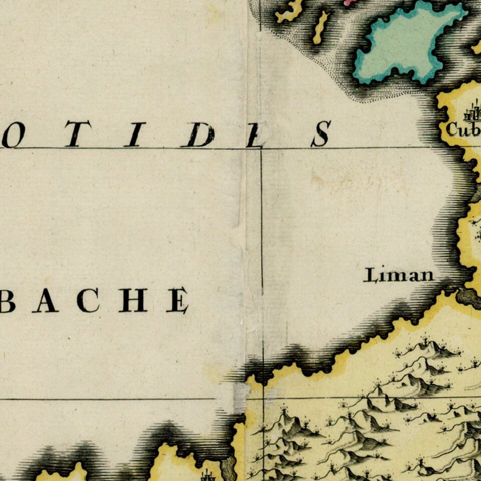 Striking map of the Sea of Azov and the surrounding regions, with a decorative allegorical cartouche, showing the costumes of the indigenous people of the region.