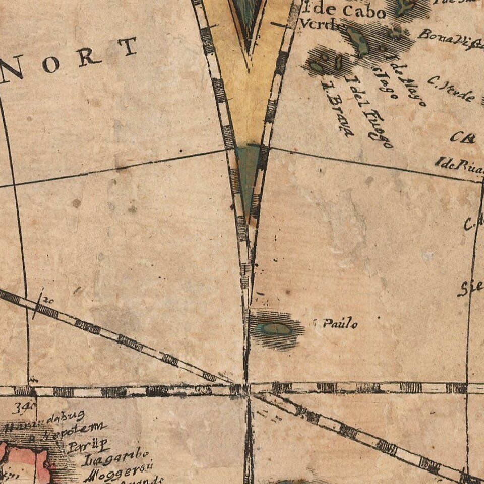 So far, the author of this outstanding four-sheet world map has not been identified. The only copy known, in the University of Leiden, carries the imprint of J. Van Keulen, almost certainly over an earlier impression which has been erased. Van Keulen's issue is unlikely to date before the 1680s.