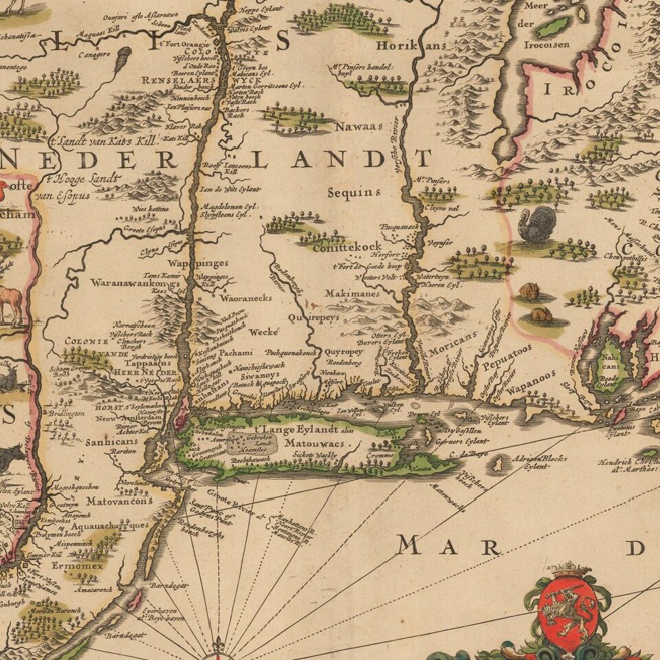Second state of Justus Danckert's map of New Netherlands, including a view of New Amsterdam, now also called "Nieuw Yorck."