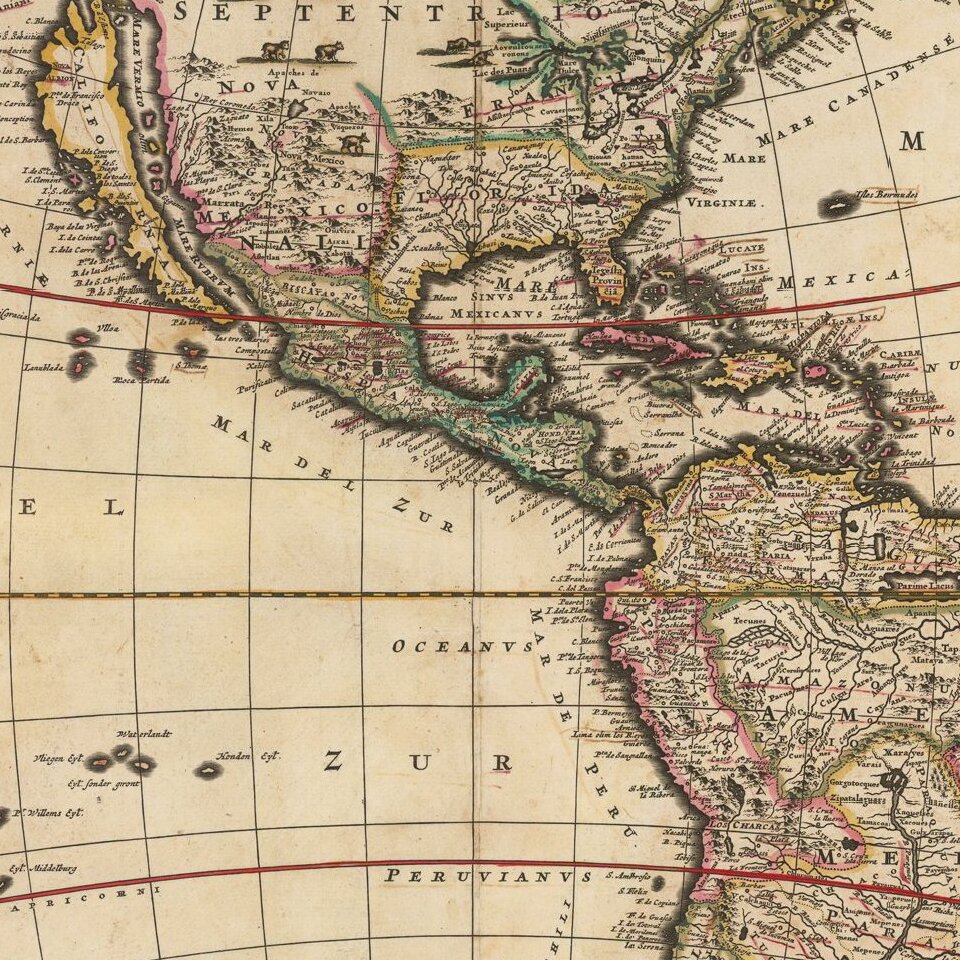 The map includes both North and South America, as well as much of the Pacific. It is based on De Wit’s earlier two maps of the continents, as well as draws on Guillaume Sanson’s map of North America, published in 1669.